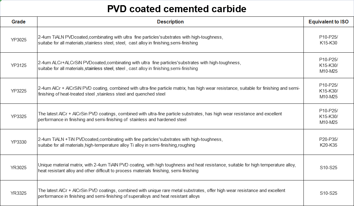 | YP3125 | 2-4um ALCr+ALCrSiN PVD涂層,結(jié)合超細(xì)顆粒高韌性基體,適合所有材料,不銹鋼、鋼、鑄造合金精加工、半精加工 | P10-P25 K15-K30 M10-M25 |